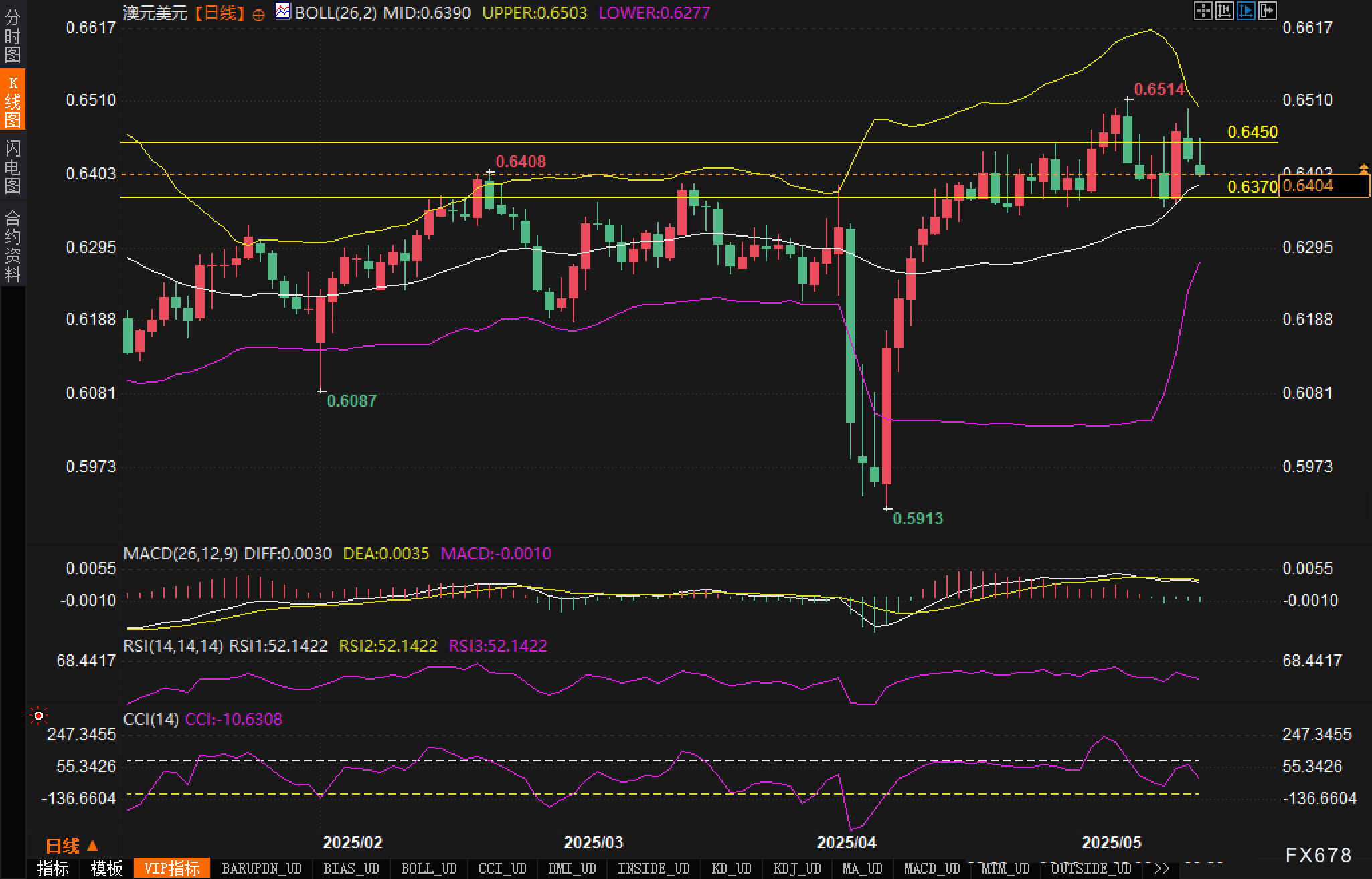 技术形态上看,澳元兑美元4月以来的反弹力度强劲,从恐慌性抛售后迅速回归理性区间,表明市场情绪从极度悲观向中性过渡。不过,当前0.6450附近遇阻回落,显示交易员在关键阻力位前保持谨慎,部分获利了结盘涌现。