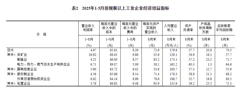 1—5月份,采矿业实现利润总额3580.4亿元,同比下降29.0%;制造业实现利润总额20201.4亿元,增长5.4%;电力、热力、燃气及水生产和供应业实现利润总额3422.5亿元,增长3.7%。
