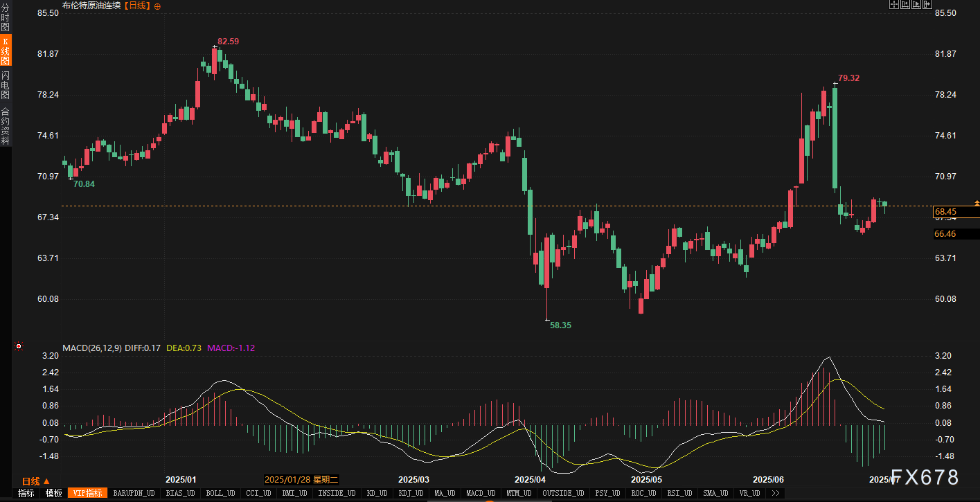 本周国际油价整体呈现先抑后扬的走势。布伦特原油期货价格在周初因OPEC+增产预期及中东地缘风险缓解而承压,跌至68美元/桶附近,但随后在市场消化增产消息及夏季需求预期支撑下逐步反弹,最终收于68.85美元/桶,单周上涨约0.6%。WTI原油期货同样受到类似因素影响,周初跌至66美元/桶下方,但周内逐步回升,收于66.41美元/桶,单周涨幅约2.2%。尽管周五受美国独立日假期交投清淡影响,油价小幅回落,但整体周线表现仍偏正面。