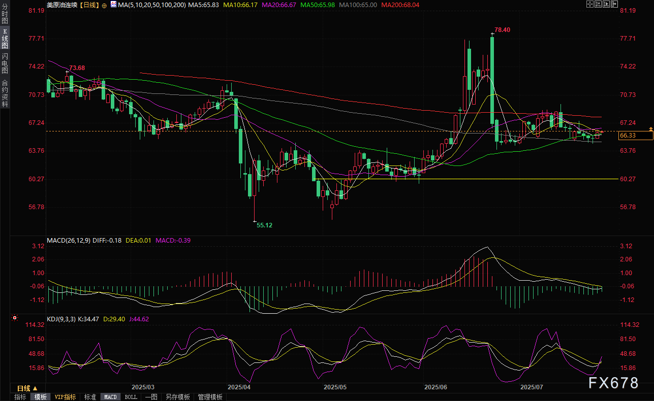 周五(7月25日)亚洲时段,国际油价震荡微涨,美原油目前交投于66.30美元/桶附近,涨幅约0.3%。周四(7月24日)国际油价在多重因素的推动下继续远离100日均线,迎来了一波上涨行情,布伦特原油期货结算价上涨0.67美元,收于每桶69.18美元,涨幅为0.98%;美国原油期货则上涨0.78美元,收于每桶66.03美元,涨幅达到1.20%。这波涨势不仅源于美国原油库存的意外下降和俄罗斯汽油出口的潜在限制,还受到美国可能放宽对委内瑞拉制裁的复杂影响,以及加沙地缘政治局势的紧张情绪。
