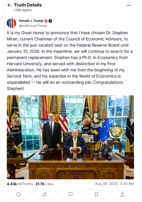 特朗普在其社交媒体平台Truth Social上发帖称,“我非常荣幸地宣布,我已经选择现任经济顾问委员会主席斯蒂芬·米兰博士担任美联储理事会刚刚空缺出来的席位,直到2026年1月31日。”